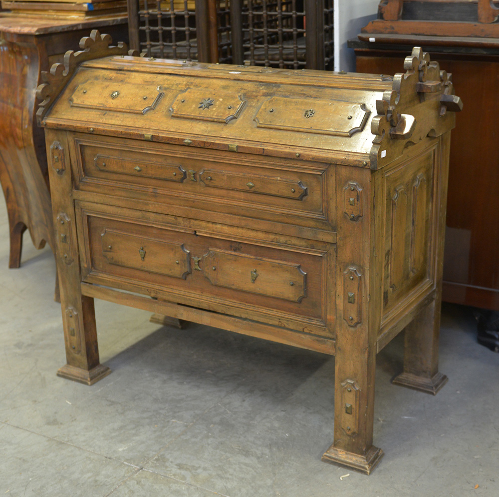 Madia con sportello basculante e vano. Decorata a formelle modanate e borchie. Coperchio decorato alle estremità da fregi sagomati (cm 114x101x54) (difetti)