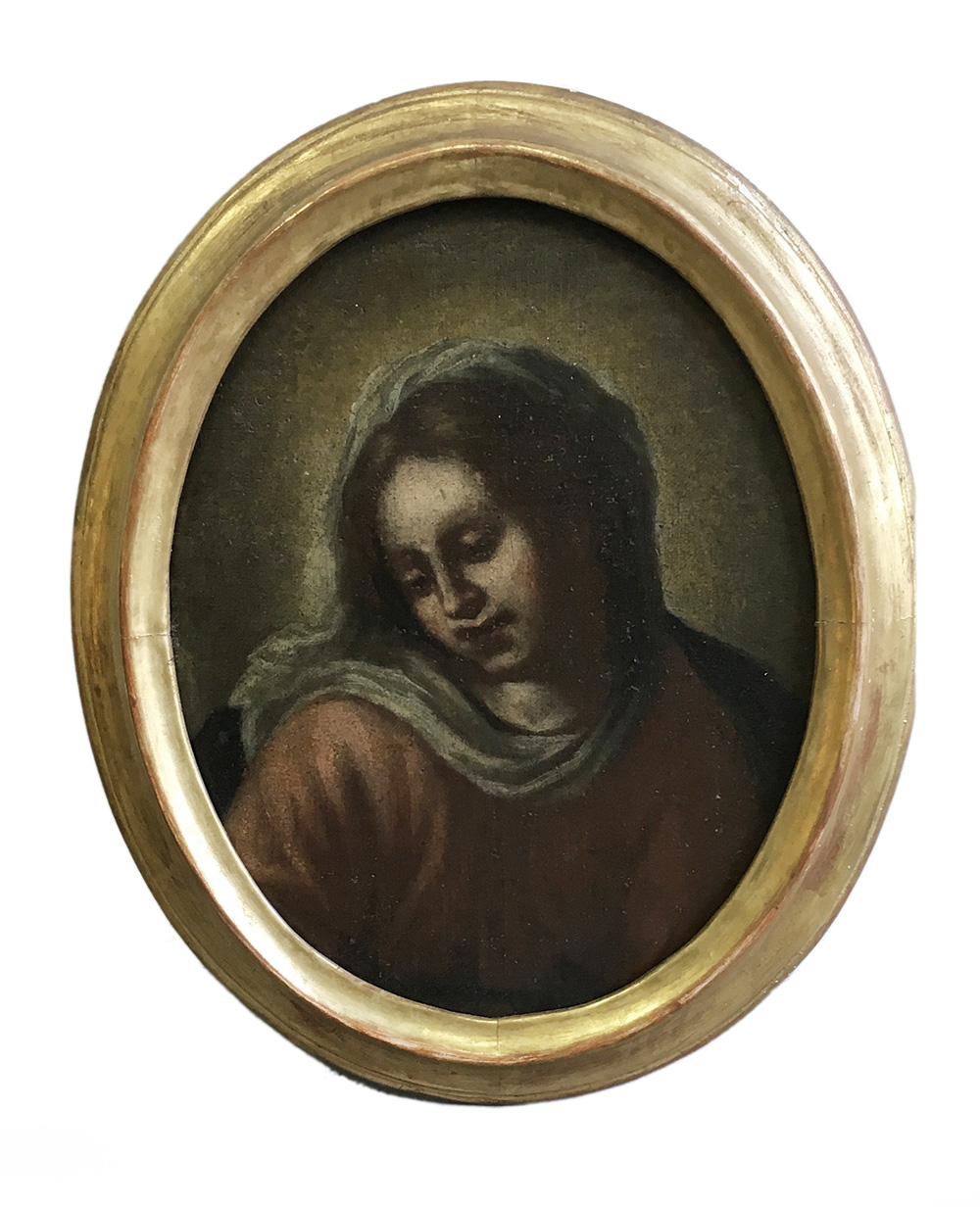 Scuola degli inizi del secolo XVIII "Madonna" olio su tela, in ovale (cm 31x24,5) in cornice antica (difetti e restauri)