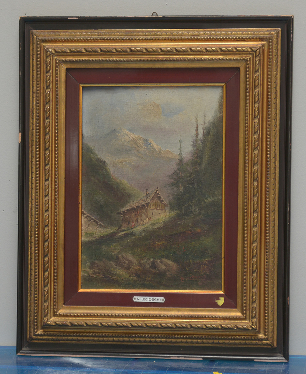 A. Brioschi, "Paesaggio montano" olio su tela applicata su cartone (cm 34x24). In cornice in legno dorato