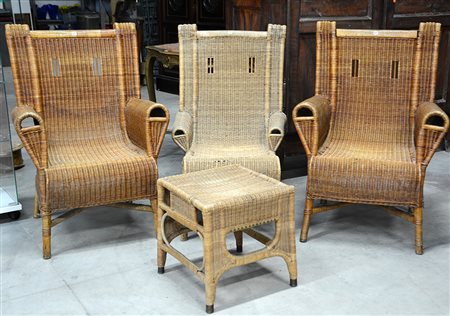 Tre poltrone e un pouf in goinco e malacca. Italia, anni '10. (difetti)-ENTre...