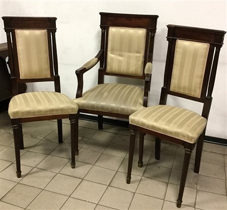 Lotto composto da una poltrona e due sedie con montanti torniti e capitelli...