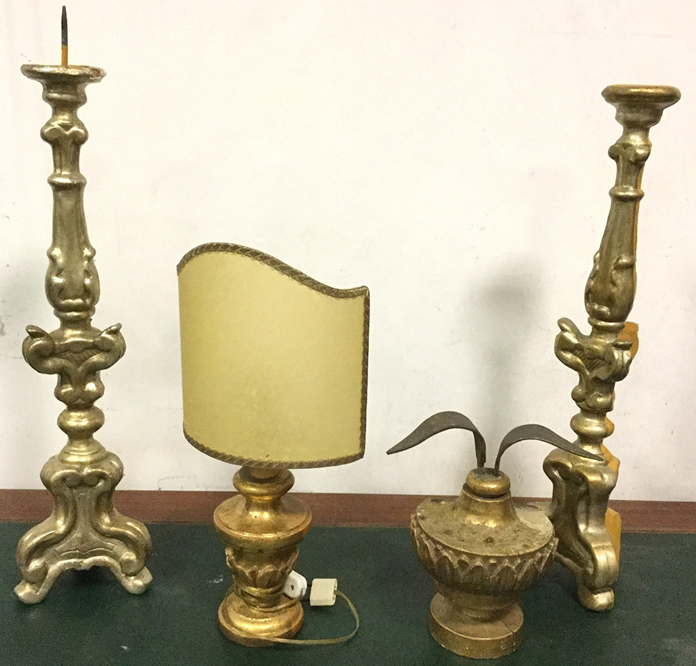 Lotto composto da una coppia di porta ceri, una lampada da tavolo e un porta palme in legno intagliato (h max cm 59) (difetti)
