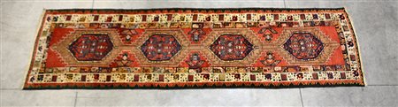 Tappeto passatoia Bidjiar, Persia, inizio secolo XX. Disegno a quattro medaglioni nei toni dell'azzurro, rosa, giallo e bianco su fondo cammello. Bordura principale a fondo bianco (cm 336x98) (difetti)