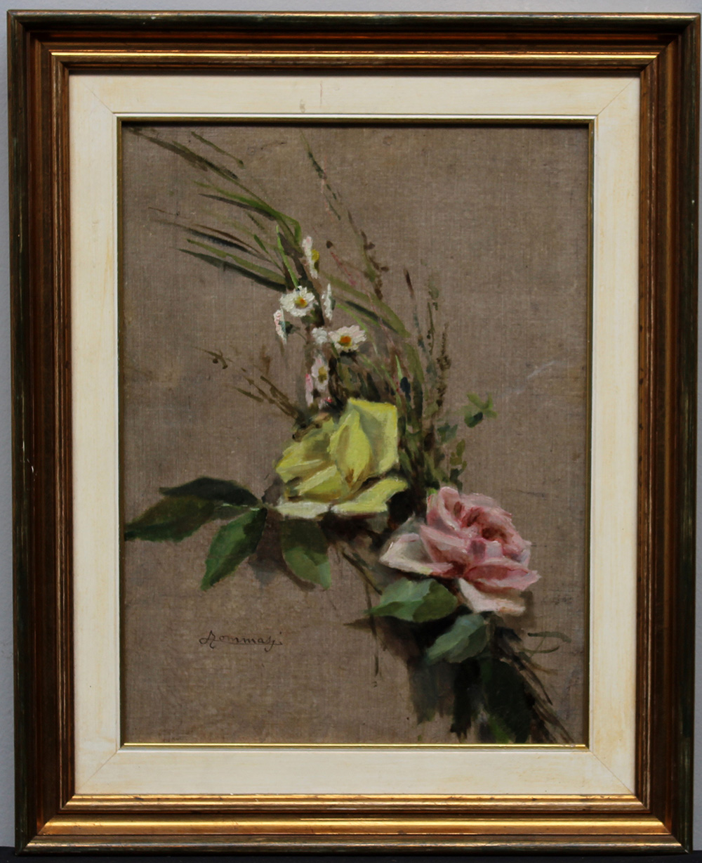 "Composizione con rose" olio su cartone telato (cm 38x29) In cornice (difetti)