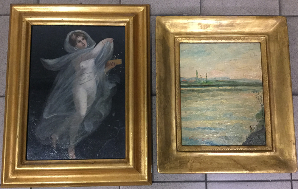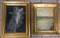 Lotto di due dipinti ad olio su compensato raffiguranti un paesaggio fluviale e l’allegoria della primavera, autori e misure differenti, in cornici (difetti)