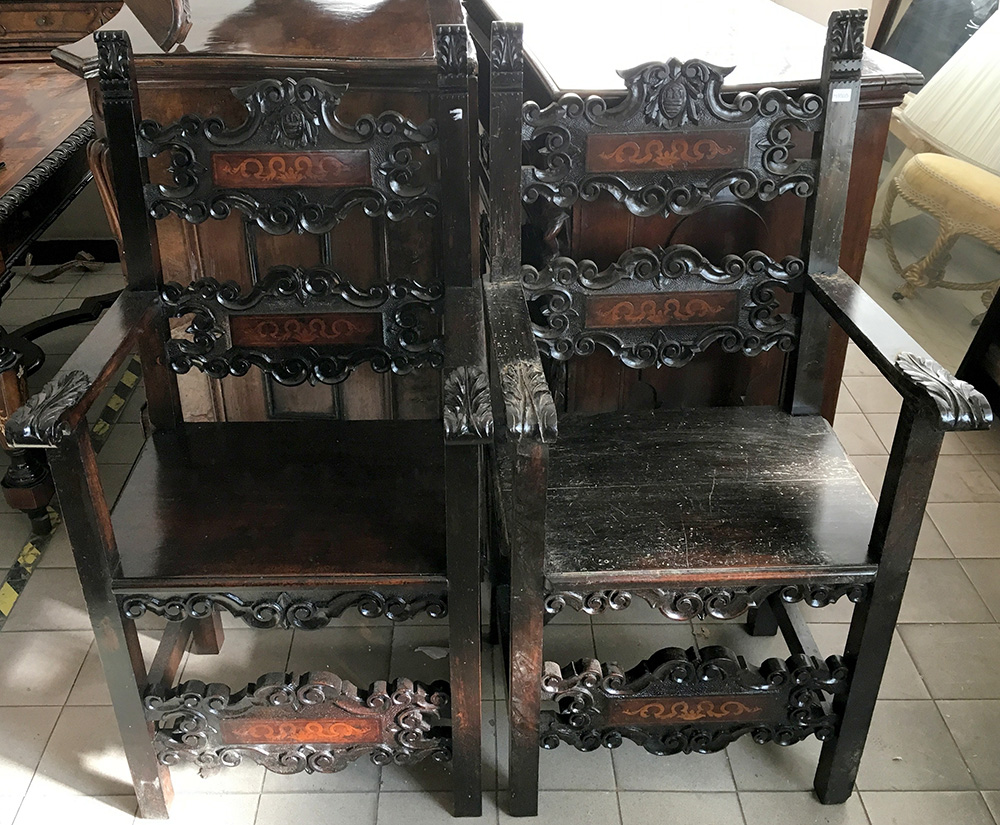 Coppia di poltrone con cartelle in legno sagomato, intagliato e intarsiato a motivi vegetali (difetti)