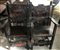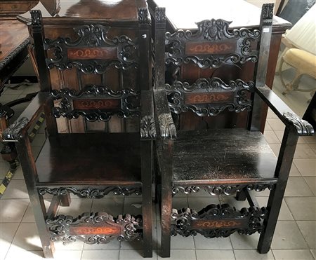 Coppia di poltrone con cartelle in legno sagomato, intagliato e intarsiato a...