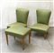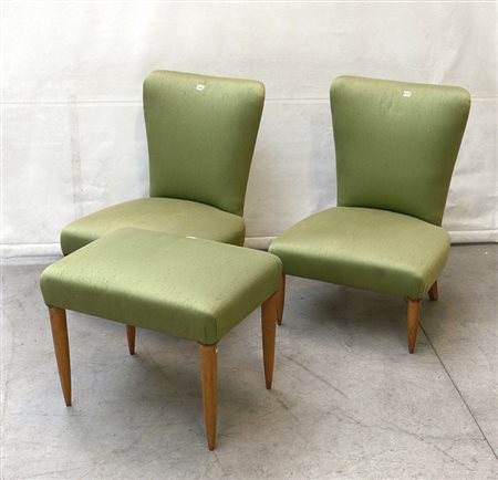 Due poltroncine da camera con pouf rivestite in tessuto verde con struttura...