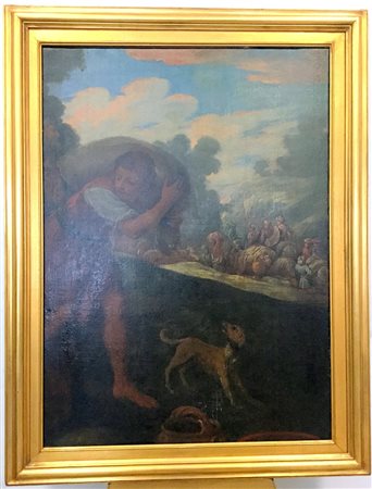 Ignoto, "Paesaggio con figure" olio su tela (cm 71x98), in cornice (difetti e restauri)