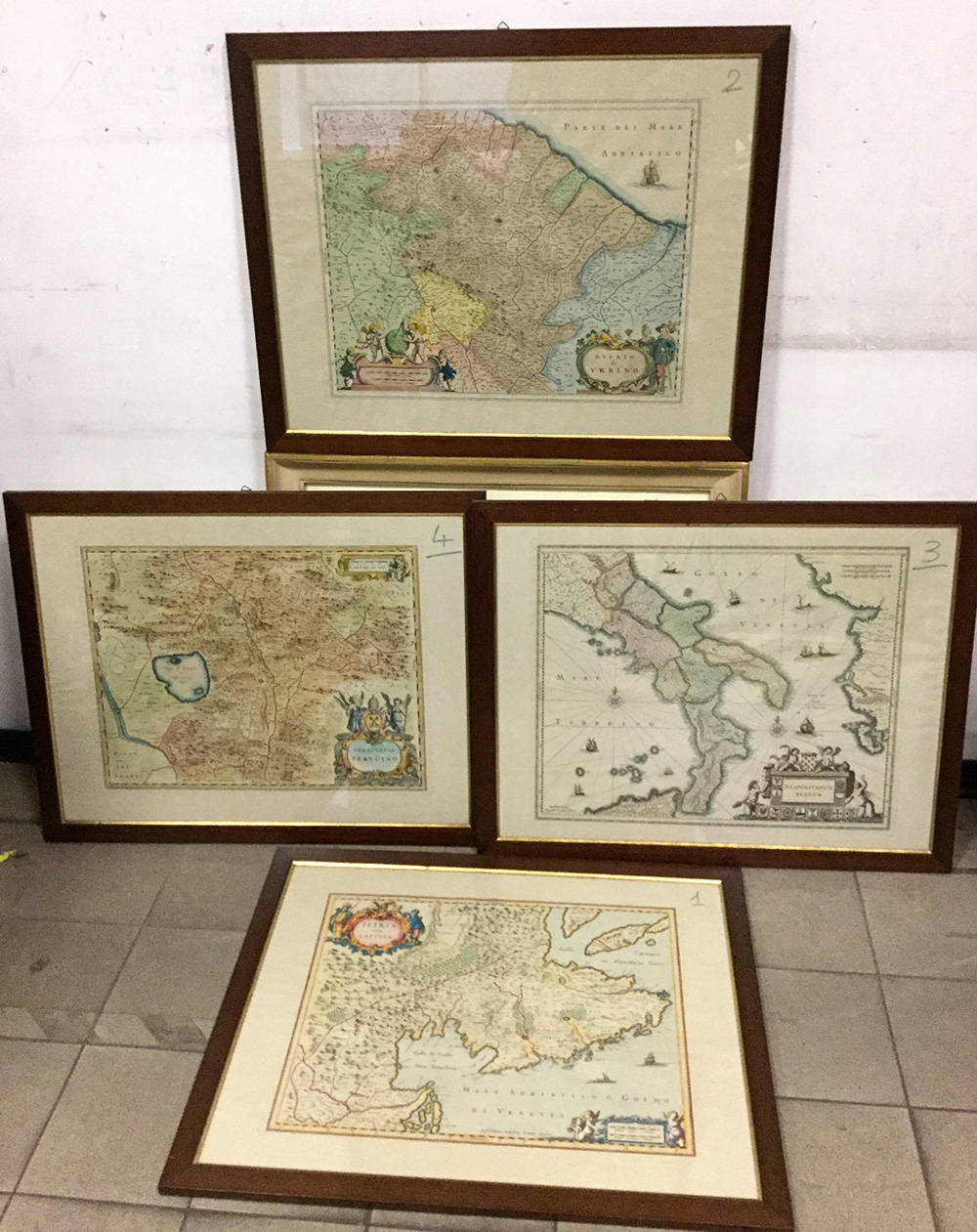 Gruppo di quattro riproduzioni a colori raffiguranti antiche mappe (cm 48x60) (lievi difetti)