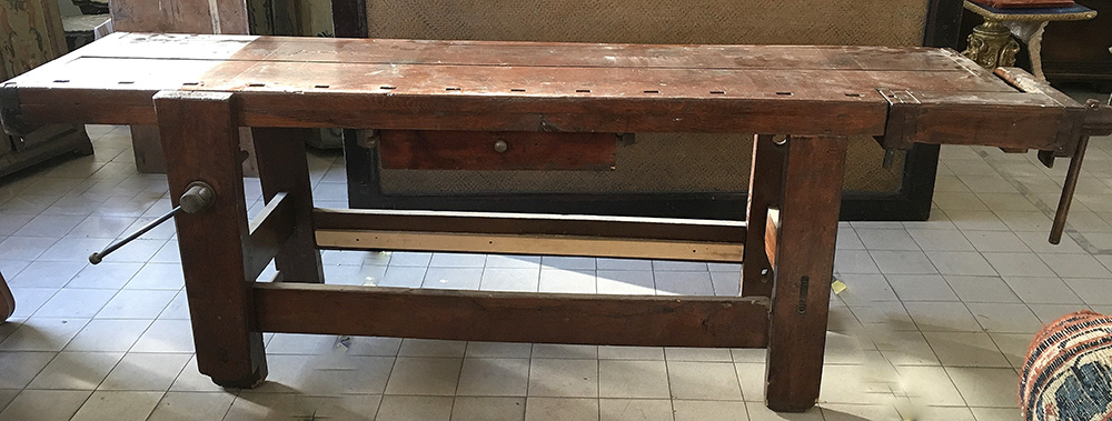 Antico tavolo da lavoro ad una morsa e cassetto sottopiano (cm 270x85x62) (difetti)