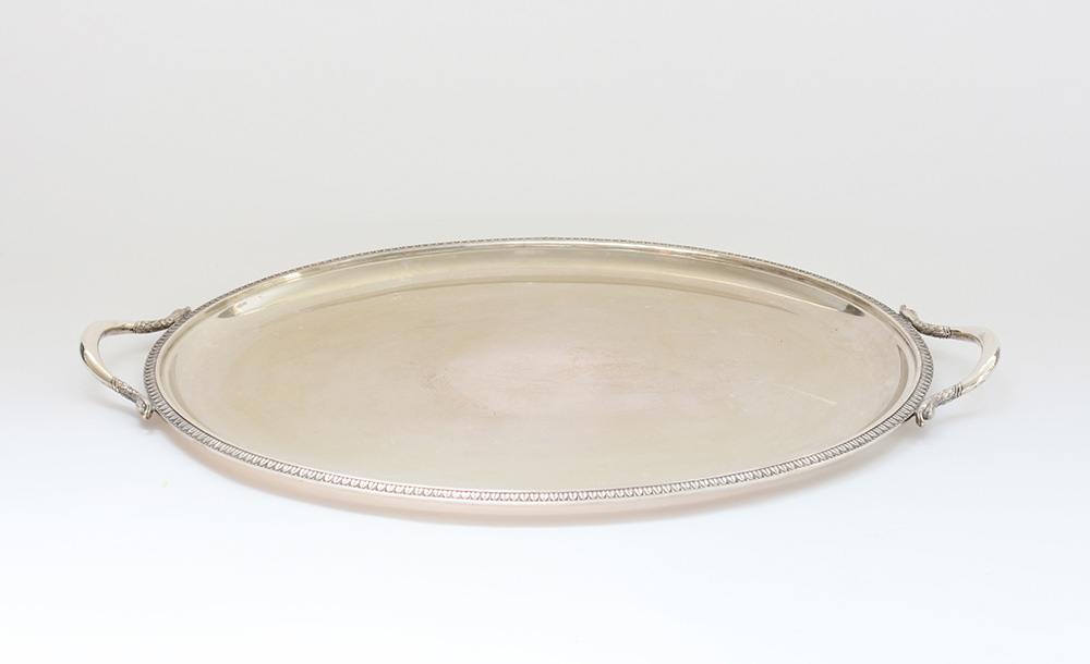 Vassoio biansato in argento di forma ovale con bordura a palmette e manici con attacchi a teste di cigno. Argentiere Cadevilla Milano, metà secolo XX (cm 64,5x43) (g 2740 ca.)