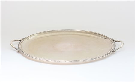 Vassoio biansato in argento di forma ovale con bordura a palmette e manici...