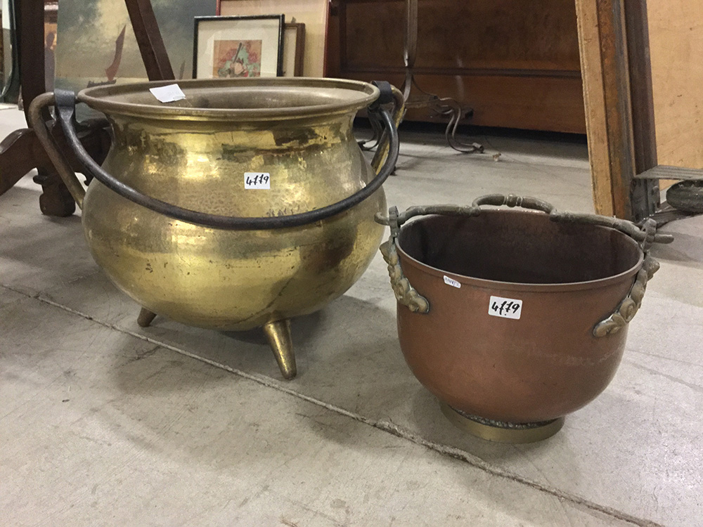 Lotto di due contenitori con manici in rame, misure diverse (difetti)
