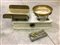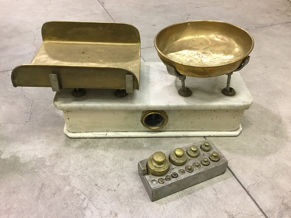 Bilancia con cassa in legno e marmo bianco con piatti in ottone, unita a un contenitore con pesi (difetti e mancanze)