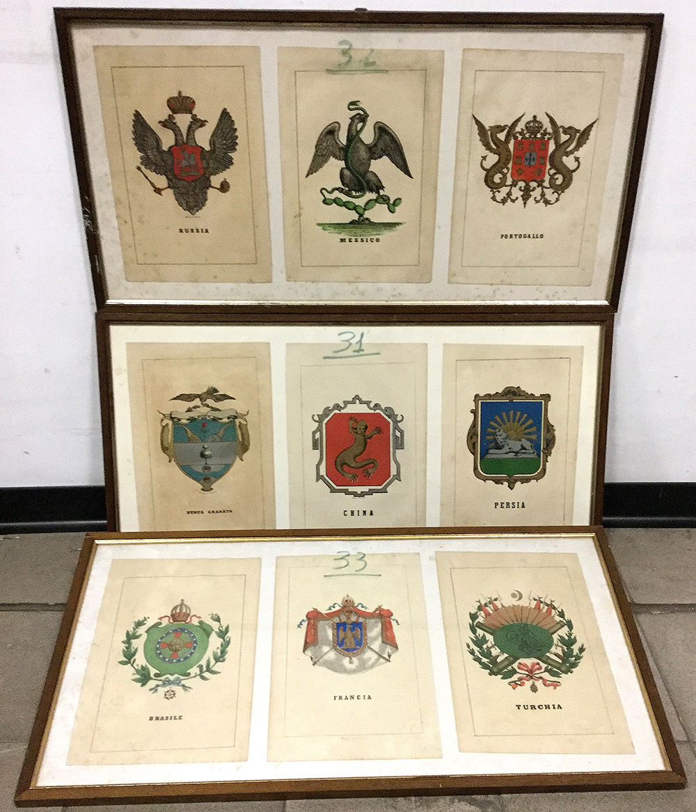 Gruppo di nove incisioni a colori raffiguranti stemmi delle nazioni, in tre cornici (difetti)