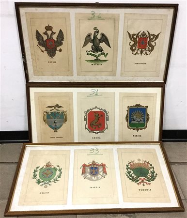 Gruppo di nove incisioni a colori raffiguranti stemmi delle nazioni, in tre...