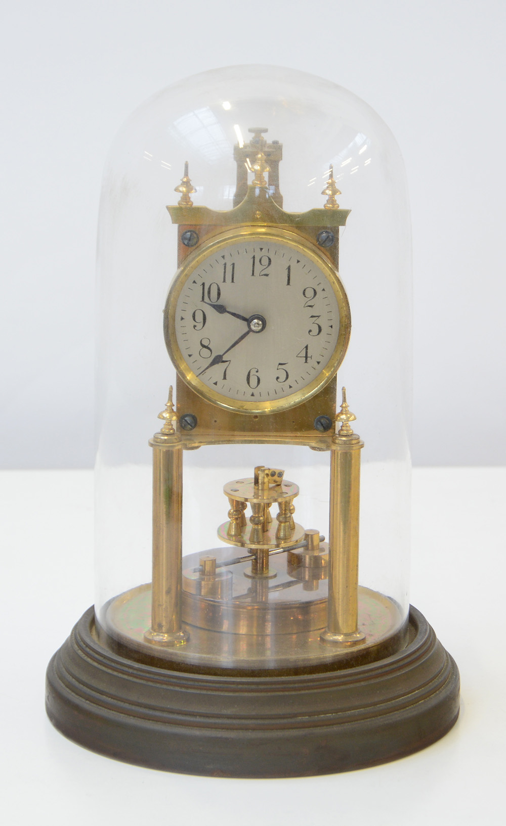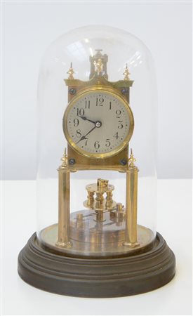 Orologio da tavolo in metallo del tipo 400 giorni, quadrante argentato con numeri romani, entro campana di vetro. Siglato BHA al retro (h. tot. cm 28,5)