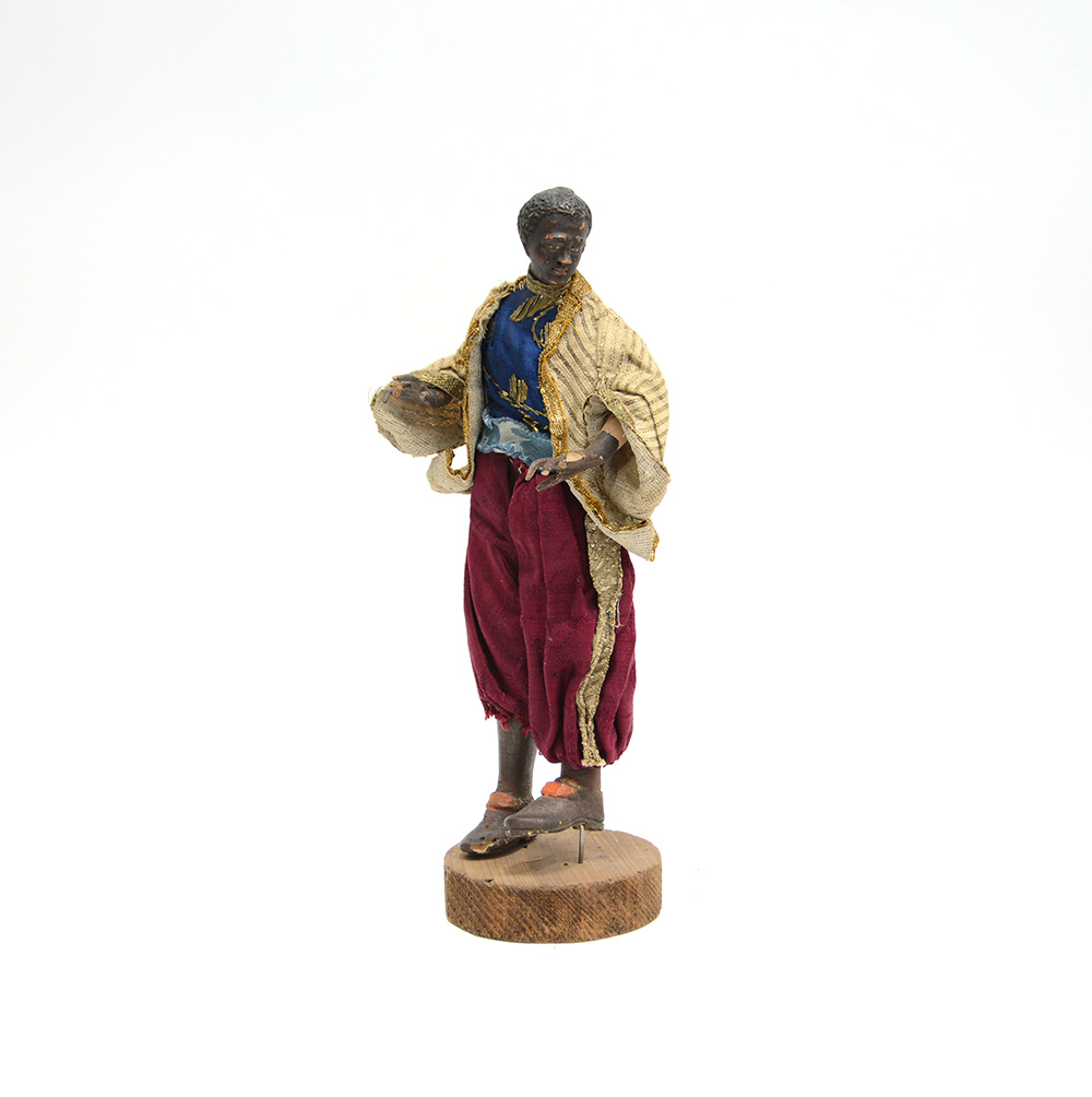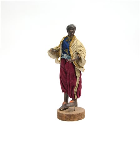 Figura da presepe in legno laccato raffigurante moro, occhi in vetro e vesti in stoffa. Secolo XIX (h. cm 28) (mancanze)