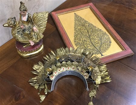 Manifattura indiana, lotto composto da un copricapo femminile in metallo dorato, una scultura in legno intagliato raffigurante una fanciulla seduta su un uccello e un pannello decorativo raffigurante una foglia (h max cm 28) (difetti)
