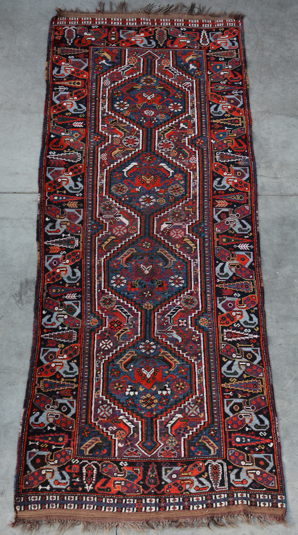 Tappeto Qashqai, Persia, inizio secolo XX. Disegno con quattro medaglioni su fondo azzurro decorati in policromia. Bordura con boteh “madre e figlia” e cipressi (cm 279x108) (difetti)