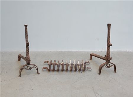 Coppia di antichi alari e portalegna (difetti)