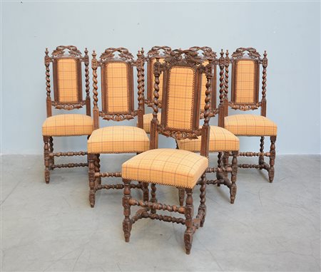 Gruppo di sei sedie con schienale intagliato e traforato. Montanti e gambe a torciglioni riunite da traverse (difetti)