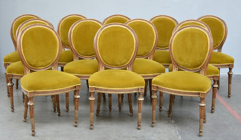 Gruppo di dodici sedie con schienale sagomato e gambe scanalate, rivestite in velluto verde
