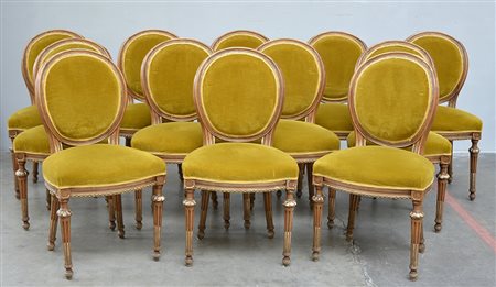 Gruppo di dodici sedie con schienale sagomato e gambe scanalate, rivestite in...