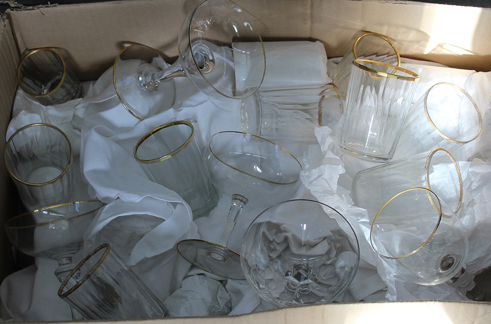 Cartone contenente numerosi bicchieri in vetro con bordo dorato e oggetti...