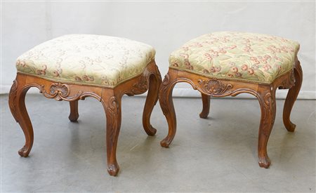 Coppia di panchetti in legno intagliato con fascia e gambe mosse e sedute in...