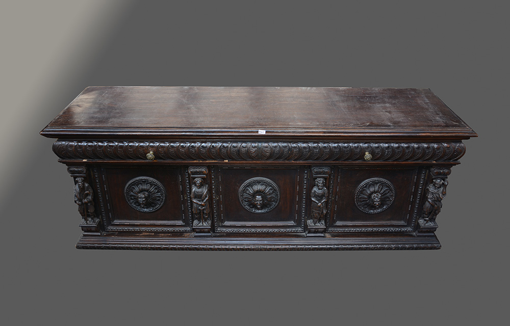 Credenza in stile rinascimentale a due cassetti e tre ante con montanti intagliati a figure (cm 179x130x51,5)(difetti e mancanze)