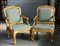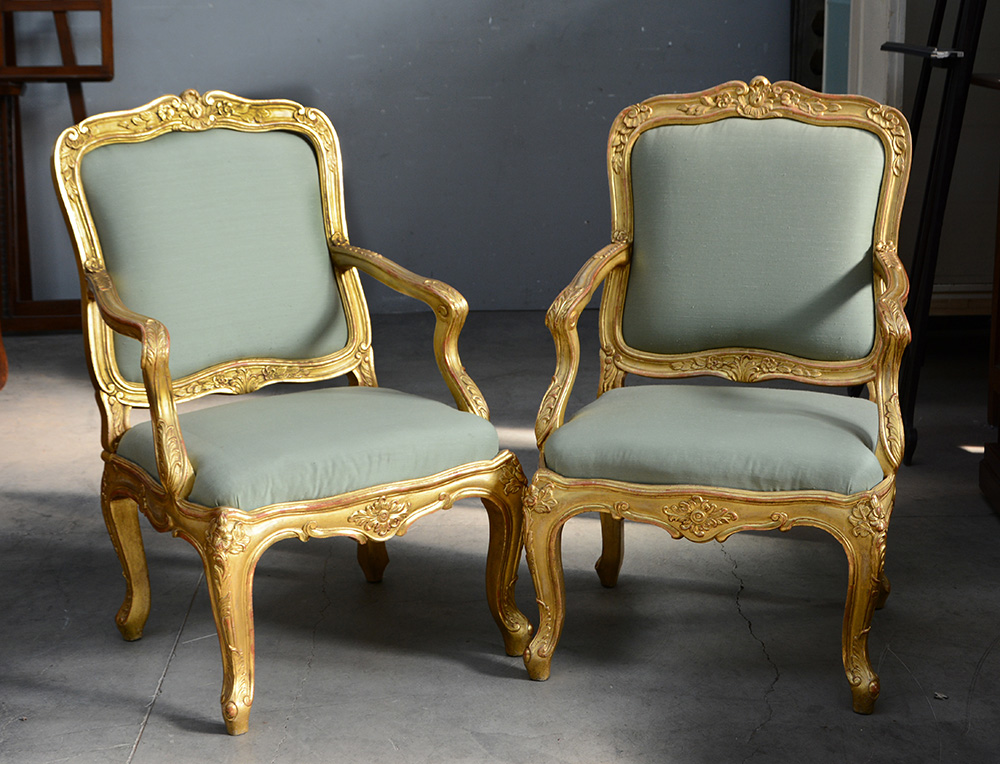 Coppia di poltrone in stile settecentesco in legno intagliato e dorato a fiori e motivi vegetali, rivestite in tessuto verde (difetti)
