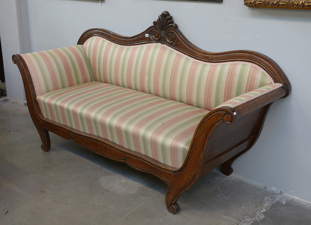 Divanetto a due posti con struttura mossa in legno intagliato, rivestimento con tessuto a righe. Secolo XIX (cm 180x90x59) (difetti)