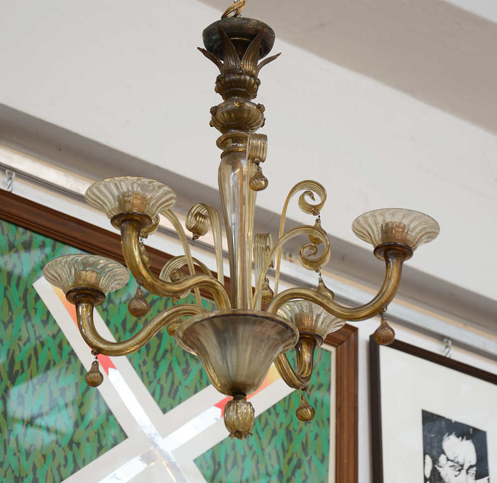 Manifattura di Murano, lampadario a quattro luci decorato a foglie e pendagli...