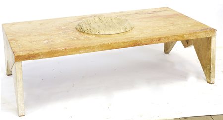 Tavolo da salotto in travertino con gambe triangolari e piano centrato da piatto circolare. Italia, anni 80 (cm 142x41x80) (lievi difetti)
