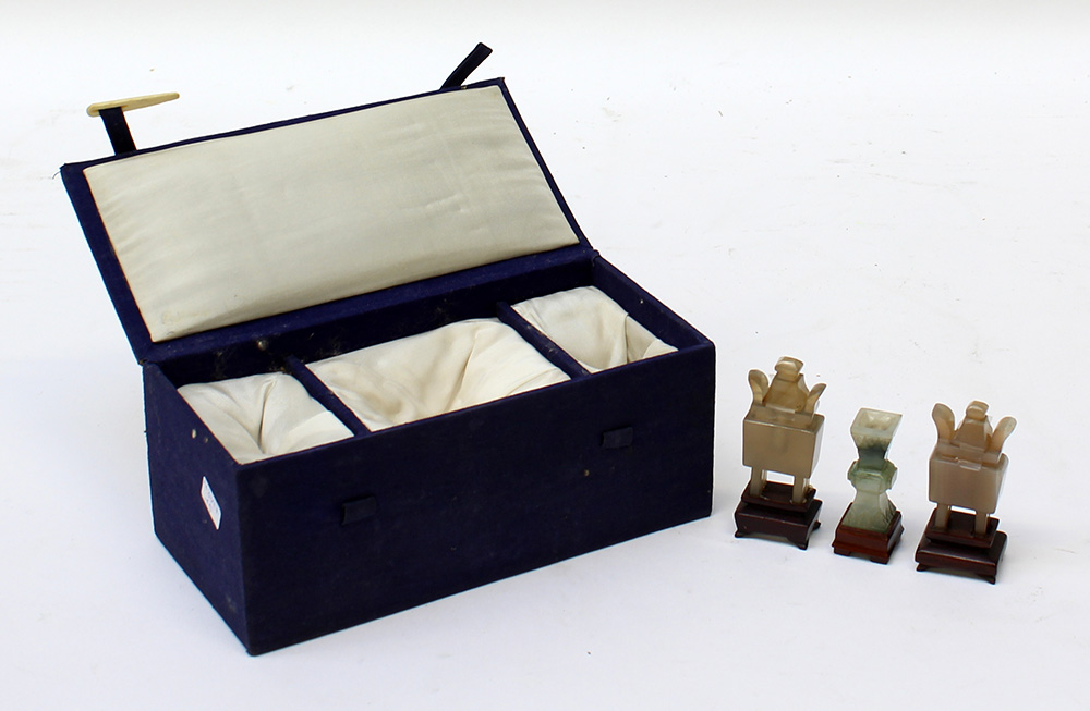 Set da altare in miniatura composto da due incensieri e un vaso gu in pietra dura con base in legno. Con scatola