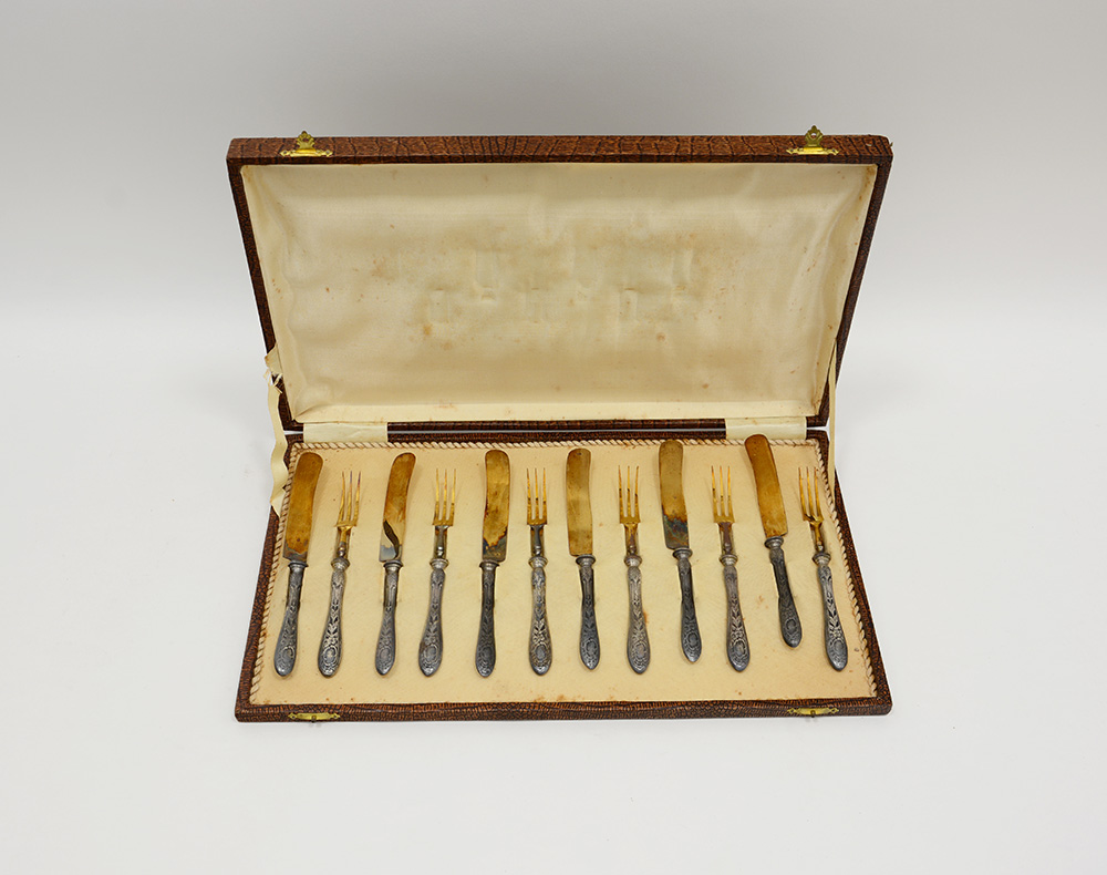 Set di posate da dolce in metallo. In cofanetto (difetti)