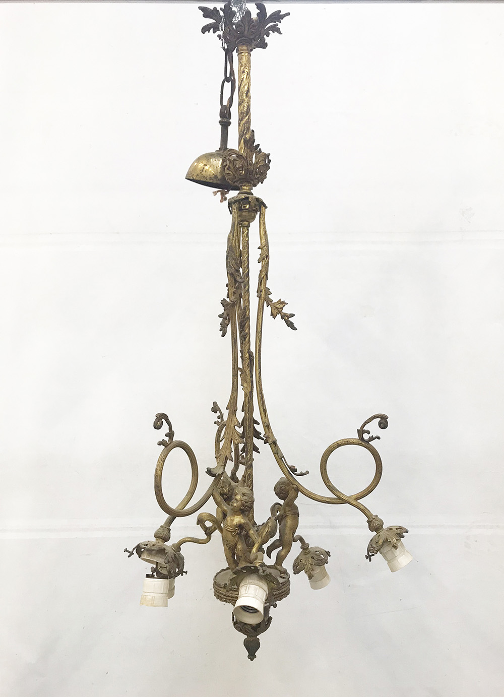 Lampadario liberty a sei luci con fusto in metallo dorato decorato a putti e...