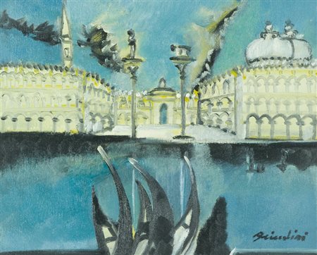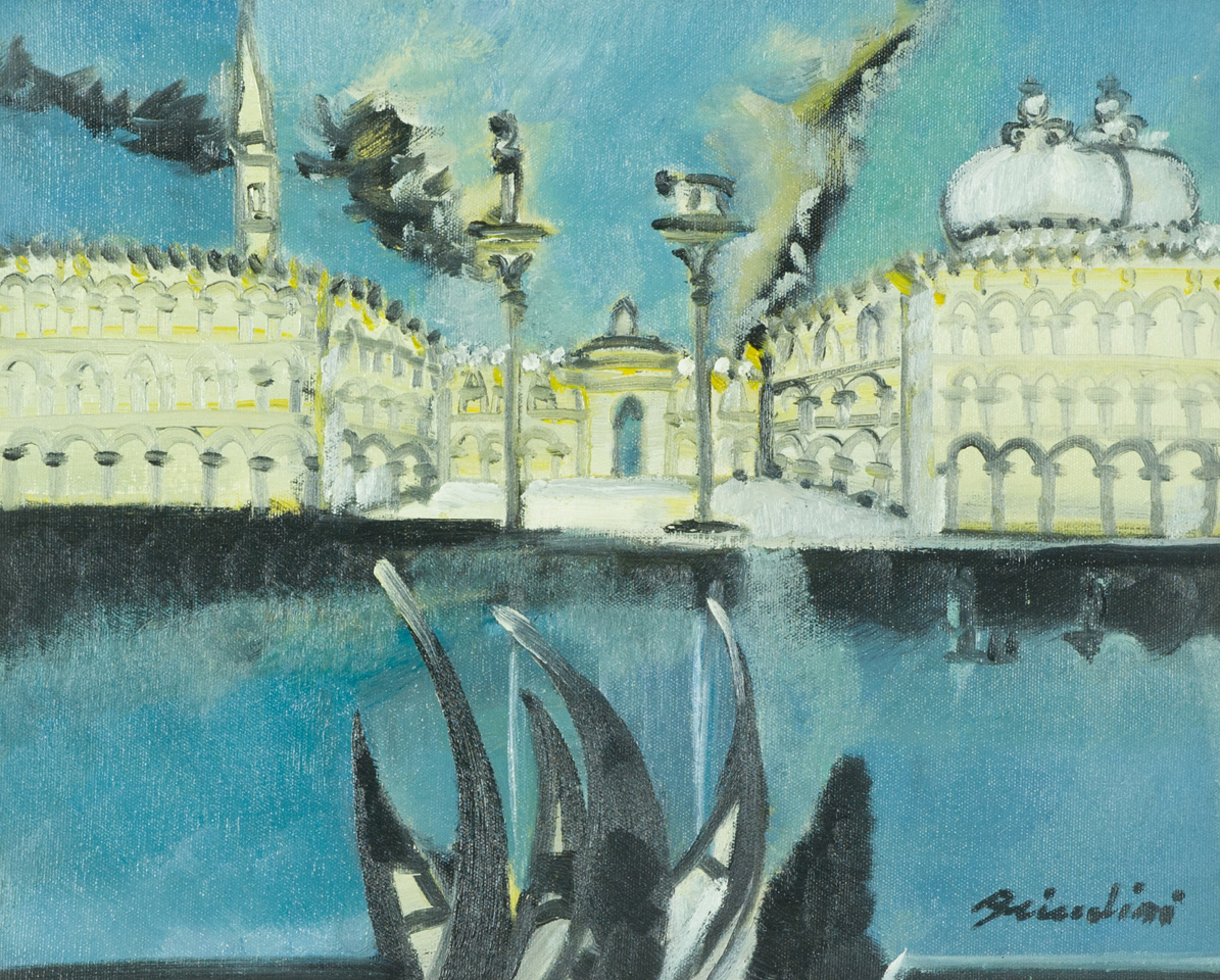 Remo Brindisi Venezia Olio su tela, cm. 40x50 Firmato in basso a destra. Sul verso: scritto di Autenticità dell'Artista; Etichetta "Catalogo Generale Galleria d'Arte Pace, con n° 3245.". Autentica dell'Artista su foto con Archivio n° 3245 "Galleria Pace", Milano.