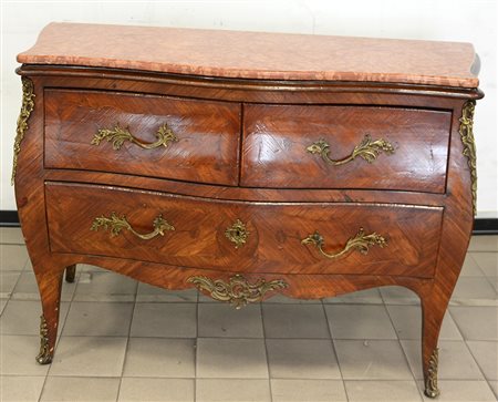 Cassettone di forma mossa a due mezzi cassetti ed un cassetto grande nella fascia inferiore. Montanti decorati con applicazioni in metallo dorato. Piano in marmo (cm 126x84,5x57) (lievi difetti)