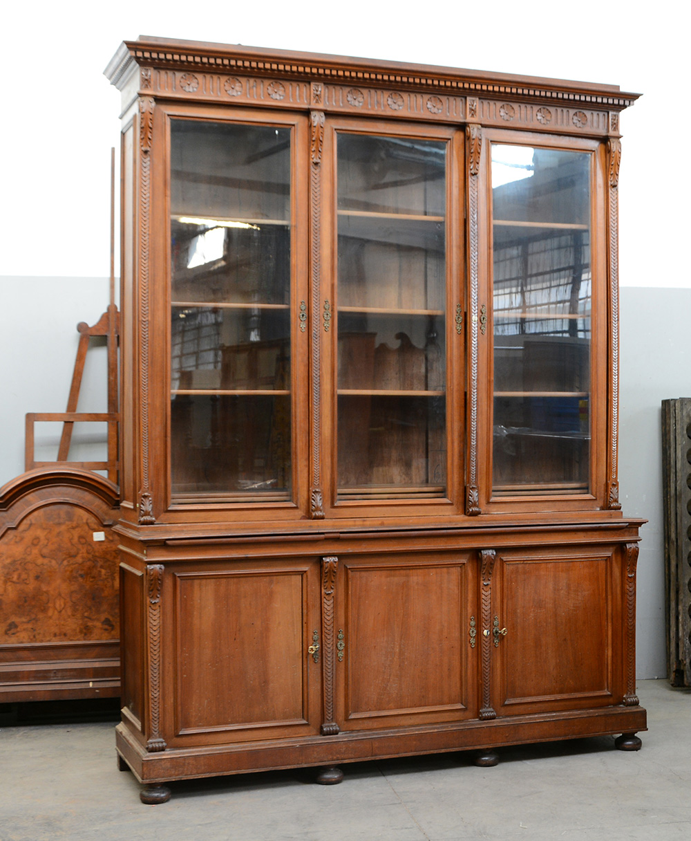 Libreria a due corpi in noce, parte superiore a tre ante a vetri, parte inferiore a tre ante riquadrate, montanti scolpiti a motivi vegetali, fascia superiore intagliata a rosoni, piedi a cipolla, fine del secolo XIX (cm 220x272x59)(difetti)