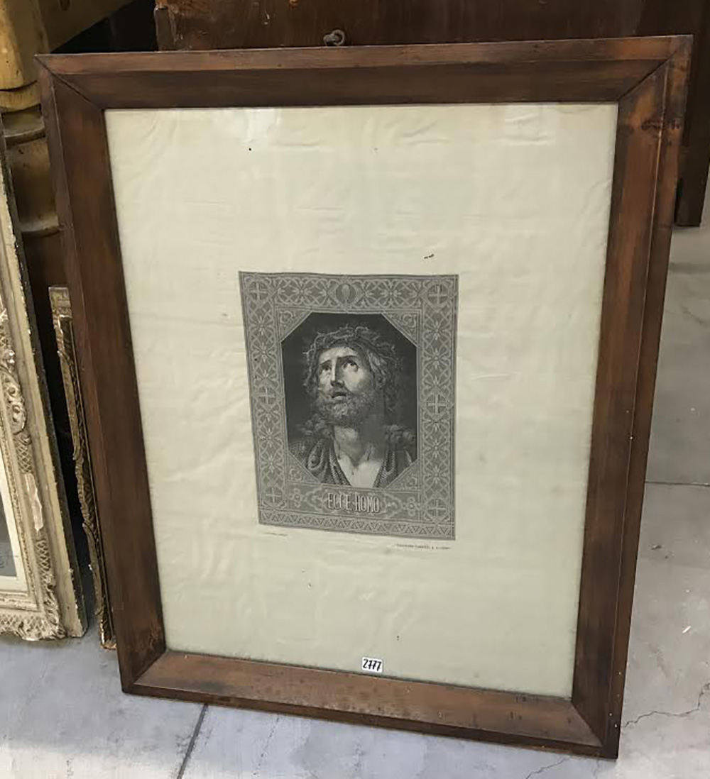 Tessuto in Jaquard in seta raffigurante Ecce Homo in tonalità di grigio. Tessitura Camozzi & C. Como. Disegno di C. Gallarini, sec. XX , in cornice (cm 65x46) (lievi difetti)