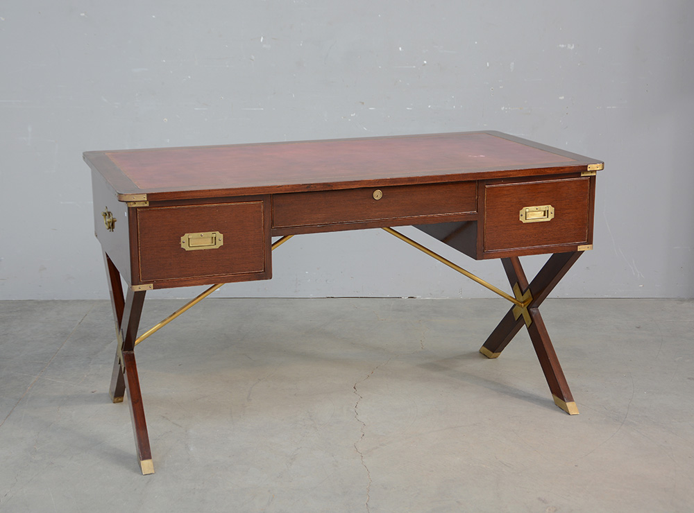 Scrivania navy da centro in mogano a tre cassetti sul fronte, piedi rastremati e ferramenta in ottone. Piano in pelle impressa. Inghilterra sec. XX (cm 141x79x77)(difetti)