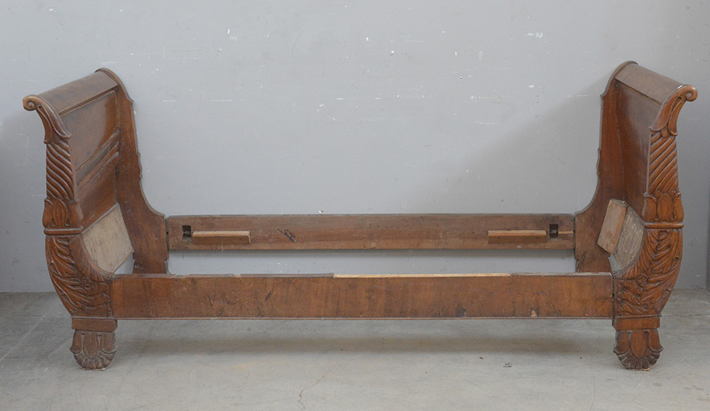 Letto a barca a una piazza in noce con montanti intagliati a motivi vegetali e volute, secolo XIX (difetti)