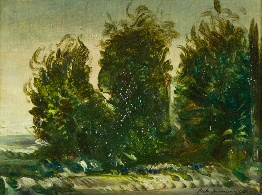 Pietro Annigoni Paesaggio Olio su cartone, cm. 15x20 Firmato in basso a destra. Autentica di Benedetto Annigoni su foto, su carta semplice.