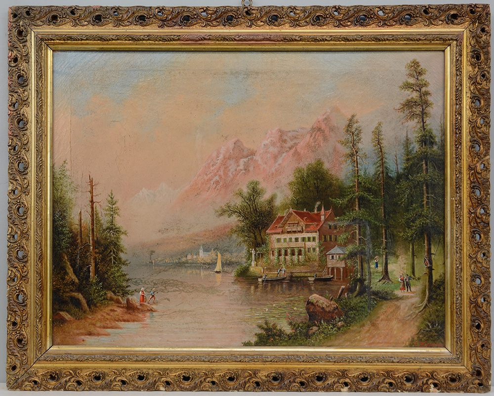 Firma indecifrata "Scorcio fluviale con villa e viandanti" olio su tela (cm 70x90) firmato in basso a destra, in cornice di pastiglia dorata (difetti e mancanze)