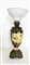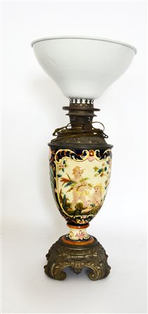 Lampada ad olio in metallo e ceramica decorata con scene di giochi con putti e motivi vegetali. Montato a luce elettrica (h cm base 40) (lievi difetti)