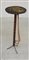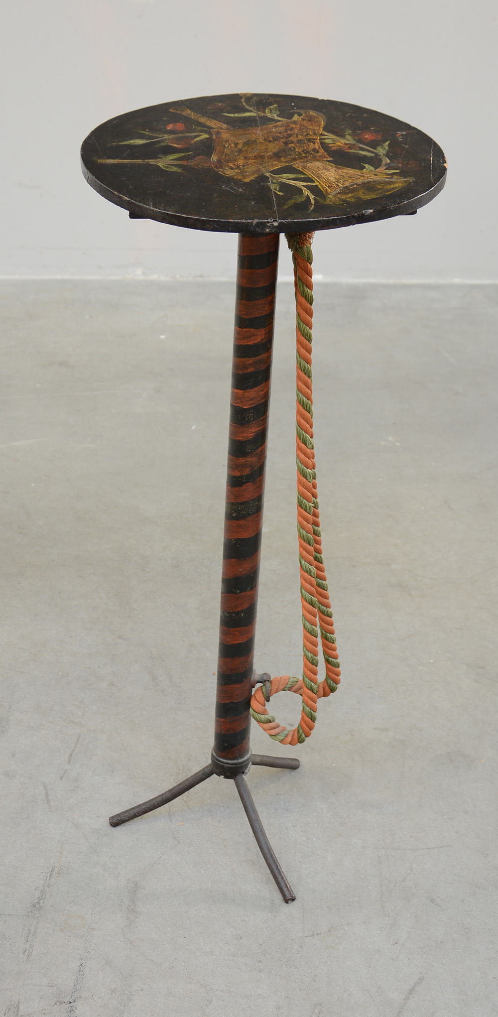 Tavolino con pianetto tondo laccato in policromia, gamba tornita terminante a tre piedini in ferro(h cm 77)(difetti).