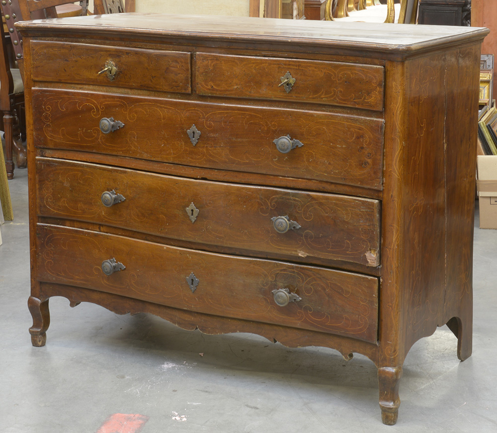 Comò in noce a due cassetti in linea sottopiano e tre sul fronte mosso, interamente filettato in legno chiaro a motivi vegetali, piedi sagomati, secolo XVIII (cm 127x100x60) (difetti, restauri e mancanze)
